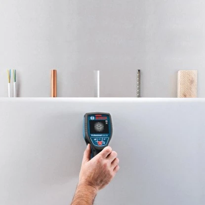 Mithilfe des Bosch Professional Ortungsgeräts erkennen Sie magnetische Metalle, spannungsführende Leitungen, wasserführende Kunststoffrohre und stromführende Kabel. Der intuitive Radarscanner eignet sich für fast alle Materialien.