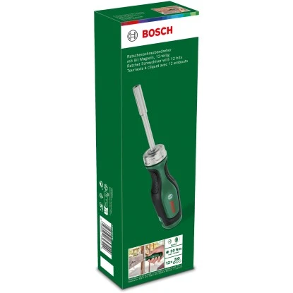 Der Bosch Ratschenschraubendreher mit 12 Bits im Handgriff ist eine Klasse für sich und ermöglicht kontrolliertes und müheloses Schrauben, sogar an engen Stellen. Die Ratsche verfügt über einen pulvermetallurgischen Zahnkranz mit 36 Zähnen und ermöglicht ein Drehmoment bis 50 Nm. Für einen schnellen Richtungswechsel lässt sich ein intuitiv bedienbarer Metallring von links nach rechts drehen, während die mittlere Position für manuelles Schrauben ohne Ratsche eingestellt wird.
