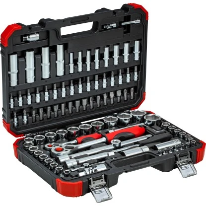 Geliefert wird das umfangreiche und klemmgesicherte Set in einem hochwertigen Werkzeugkoffer mit Metallscharnieren sowie -verschlüssen. Die Markierungen erleichtern Ihnen die Suche nach dem passenden Steckschlüssel und sparen Zeit.