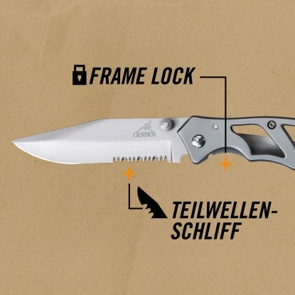 Das Gerber Paraframe I mit Teilwellenschliff ist leicht zu reinigen, zu tragen und zu öffnen und lässt sich mühelos in Ihrer Tasche oder an Ihrer Hose per Taschenclip befestigen. Dieses leichte, alltagstaugliche Messer hat eine offene Rahmenbauweise für ein ultimativ minimalistisches Design. Mit seiner Ganzstahl-Konstruktion ist das Paraframe ein nahezu unverwüstliches Messer. Die 7,9 cm lange Klinge sichert per Frame-Lock-Verriegelung gegen ungewolltes Einklappen.