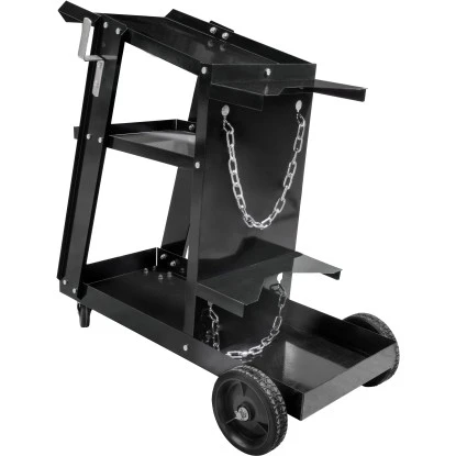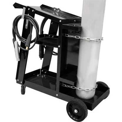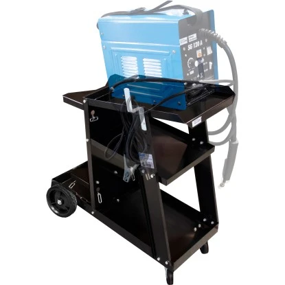 Der Wagen bietet viel Stauraum auf zwei Ebenen für alle notwendigen Schweißutensilien. Auf der oberen Ebene können beispielsweise Schweißzusatzmaterialien und Werkzeuge abgelegt werden, während auf der unteren Ebene Platz für Schutzgasflaschen oder andere größere Gegenstände vorhanden ist.