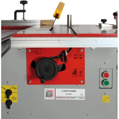 Die Holzmann 5-fach Kombimaschine K5260L ist eine kompakte Multifunktionsmaschine für ambotionierte Heimwerker. Das Kreissägeblatt ist über ein Handrad bis 45° schwenkbar. Der groß dimensionierte Abreitstisch aus Grauguss verfügt über einen Winkelanschlag (bis +/- 45°) in T-Nutenführung. Die Auswahl der Funktion erfolgt komfortabel über einen Drehschalter und drei starke Motoren sorgen für ausreichende Leistung. Des Weiteren verfügt die Kombimaschine über eine massive 3-Messerhobelwelle mit vormontierten HSS-Messern.