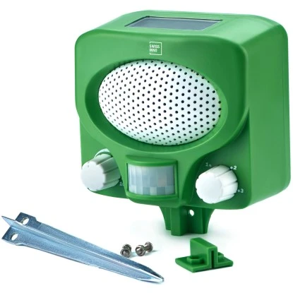 Der Swissinno Ultraschall-Tiervertreiber vertreibt auf besonders einfache Weise lästige Nagetiere, Katzen, Hunde oder anderes unliebsames Getier aus Ihrem Garten. Die leistungsstarken Ultraschallwellen lassen sich individuell steuern und schützen zuverlässig eine Fläche von ca. 100 m². Gezielter LED-Lichtstrahl dient als zusätzliche Abschreckung und kann separat zum Ultraschall zugeschalten werden. Über das Solarpanel werden die Akkus geladen. Montiert kann der Tiervertreiber mittels Bodenspieß oder Wandhalterung werden.