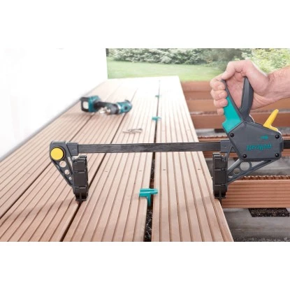 Die Wolfcraft Montagezwinge ist unverzichtbar für das schnelle und exakte Ausrichten der Terrassendielen. Sie eignet sich für Terrassendielen bis zu 20 cm Breite und richtet die Dielen exakt aus, bis sie verschraubt werden. Zusammen mit den Abstandshaltern garantiert sie ein sauberes und gleichmäßiges Verlegebild der Terrasse.